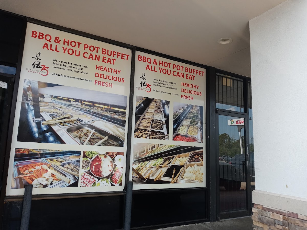 “ Want to experience Asian hotpot culture and the Chinese way to BBQ? You will find no better place than 75 BBQ and Hot Pot Buffet! My wife and I came here to celebrate our 3 year anniversary early, and we got the hotpot and BBQ buffet, which we highly recommend for anyone who is adventurous and wants the full experience! They offer various selections of red meats, poultry, seafood, vegetables and fruits you've never seen before, and not to mention sauces that you can combine to make your own original sauces for dipping! They also have different marinated meats for the BBQ! Yes, everything is raw, and you have to cook it yourself(everything cooks very quickly, around 3 minutes and some meats only about 30 secs!). Does that seem overwhelming? No problem! Victor and Victoria are incredibly pleasant servers and will be more than happy to help you if you just ask! They know how to make all the good stuff! For the hotpot, you get an option to choose between 2 boiling flavors, a chicken broth and spicy Asian one, or both at once! For the BBQ, you just throw whatever you want in and cook it however you want! Did I mention that the buffet is only 25 per person, and it also includes dessert with a mini selection of ice cream and whatever other things they've cooked? It's hard to get this much bang for your these days! We will definitely be coming back to this location at some point in the future, and 75 BBQ and Hot Pot Buffet is a place everyone should check out! ”
